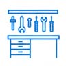 Heavy-duty racks, trolleys, and working tables for industrial use.